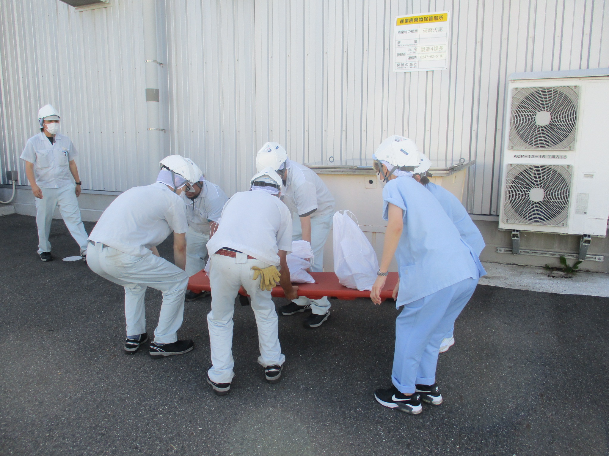 避難訓練には263名が参加し、担架を使用した搬送訓練も行いました。
